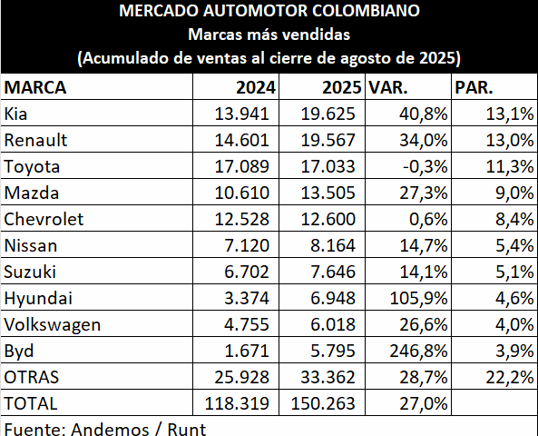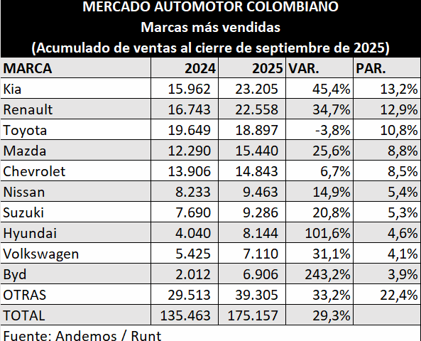 #132 Kia se consolidó en el primer lugar del mercado automotor colombiano, así como Toyota en los electrificados y BMW en los premium. Cifras de Andemos.