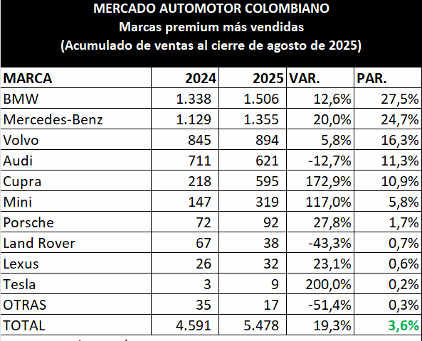 #115 El segmento premium del mercado automotor colombiano decayó en su crecimiento mensual, pero aún así describe un aumento anual del 19,3%