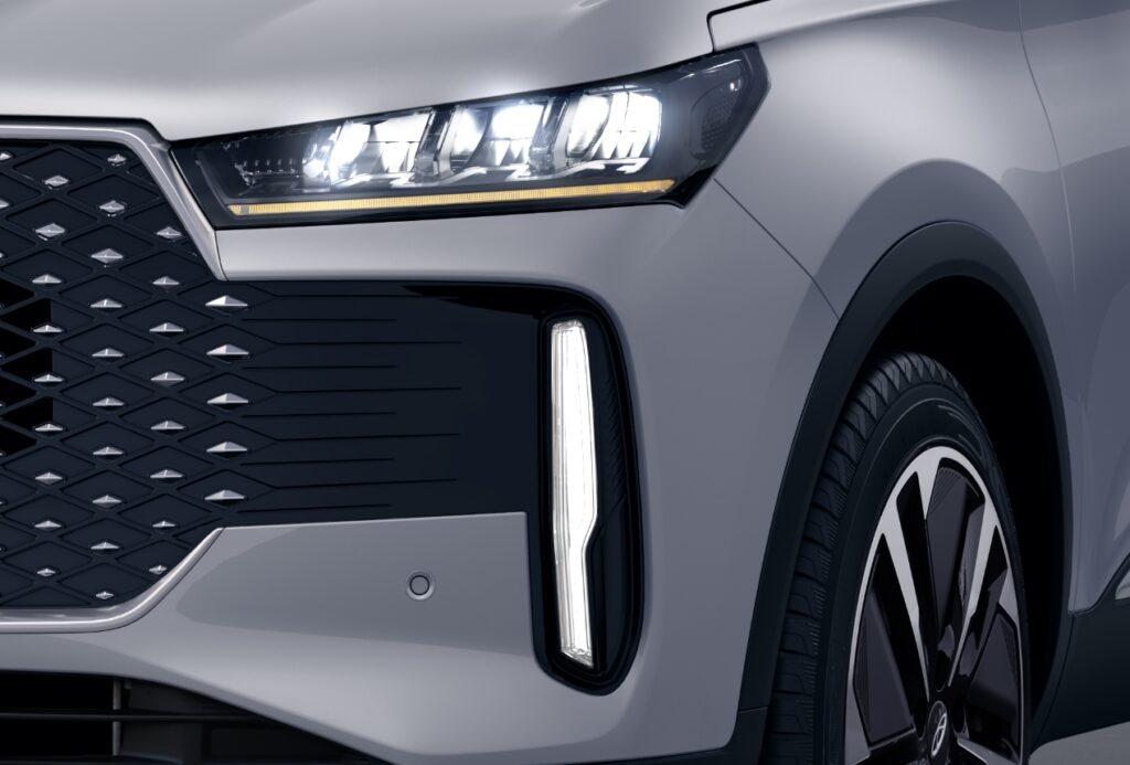 - Al frente: Destaca su parrilla «Sunshine Diamond Galaxy» con detalles cromados que le dan un aspecto de mayor calidad. Los faros principales son Full LED con un diseño afilado y luces de conducción diurna (DRL) integradas.