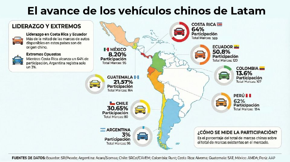 Esta Asociación Latinoamericana de Distribuidores de Automotores (Aladda) también se ocupó del impacto de la industria automotriz proveniente de la República Popular China en los países de la región y se encontró con que en Costa Rica y Ecuador más de la mitad de las marcas de autos disponibles son de este origen, mientras que en Argentina apenas llegan al 3 por ciento.
