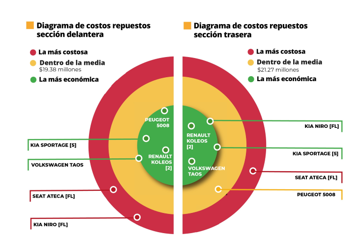 Por sju parte, la sección trasera, la Ateca y la Kia Niro concentran los mayores costos en contraste. La Taos ofrece la solución más económica.