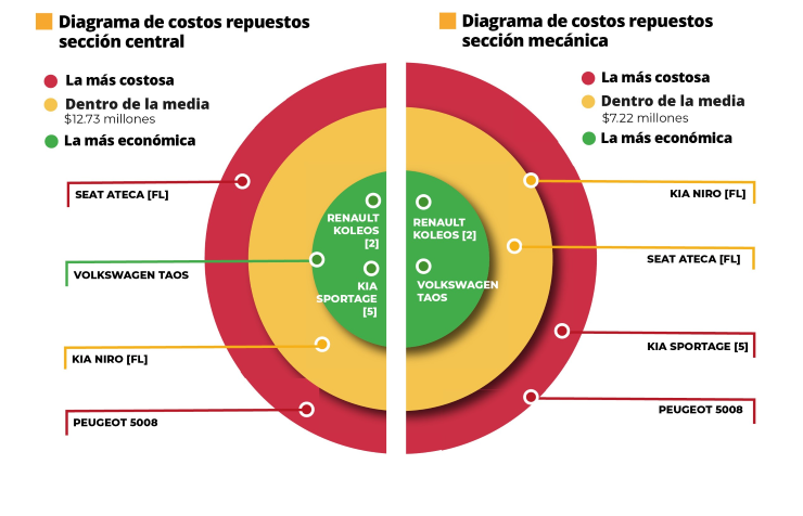 Finalmentge, en la sección mecánica, la Peugeot 5008 y la Kia Sportage presentan los valores más altos. En el extremo económico sobresale nuevamente la Taos.