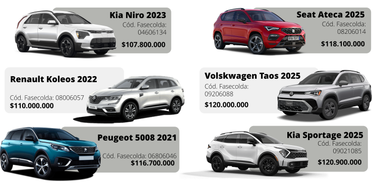 La sección central, la Ateca vuelve a encabezar los costos. Es la más costosa de este segmento, mientras que la Taos, en cambio, se consolida como la alternativa más asequible.