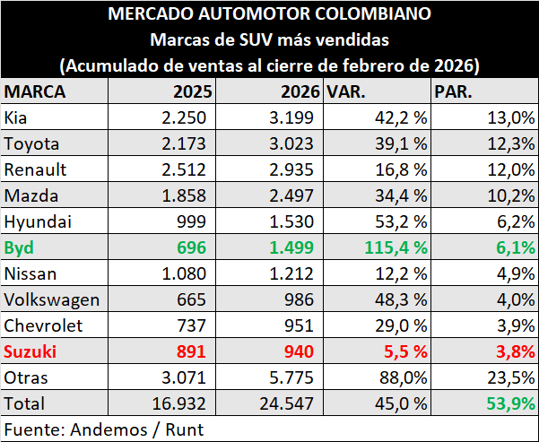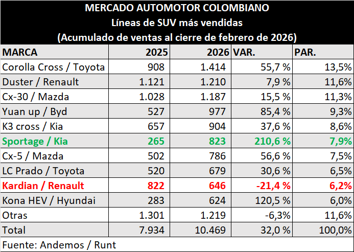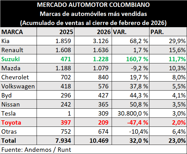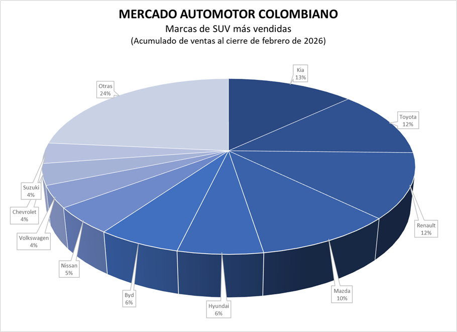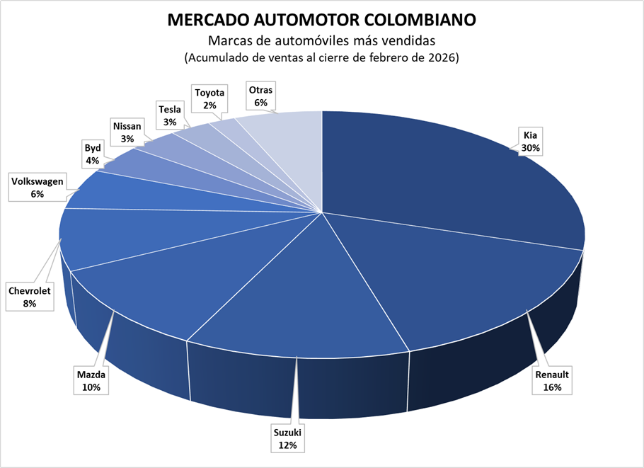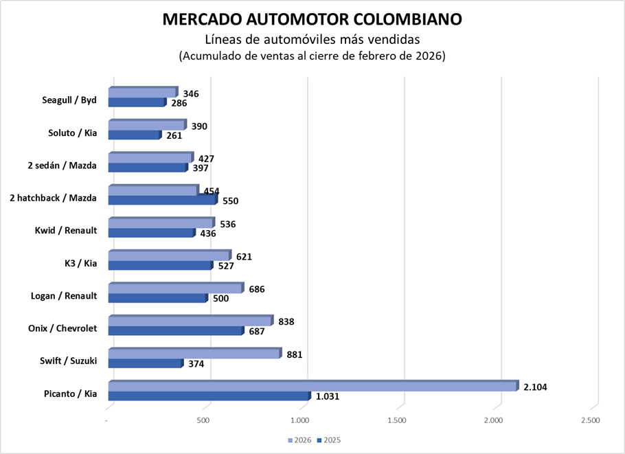 En cuanto a los automóviles, este tipo de vehículo ha descrito un crecimiento del 32% en el primer bimestre del 2026, teniendo a Kia como la marca que más vende, con un crecimiento del 68%.