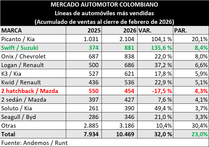 Así, el automóvil más vendido en lo que va corrido del año es el Kia Picanto, con 2.104 unidades y un crecimiento del 104%, mientras que la marca de automóviles que más crece en sus ventas es el Suzuki Swift, con un positivo del 135,6%, mientras que la que más decrece es Mazda con su modelo 2 hatchback, con un negativo del 17,5%.