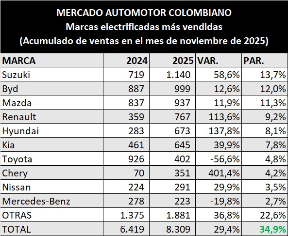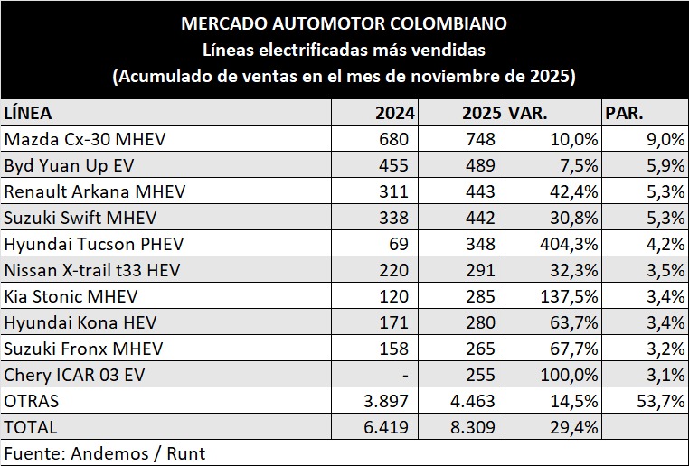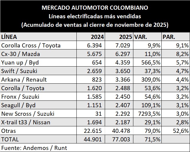 Y bueno, ya entrados en gastos, al cierre de noviembre de este año 2025, tenemos que las marcas electrificadas más exitosas son Toyota, Suzuki, BYD, Mazda y Kia, teniendo en cuenta que las líneas de vehículos más matriculadas de este año han sido la Toyota Corolla Cross, seguida de la Mazda CX 30, la BYD Yuan Up, el Suzuki SWIFT y la Renault Arkana.