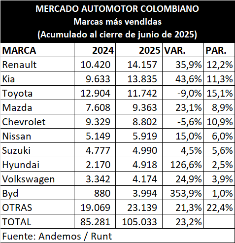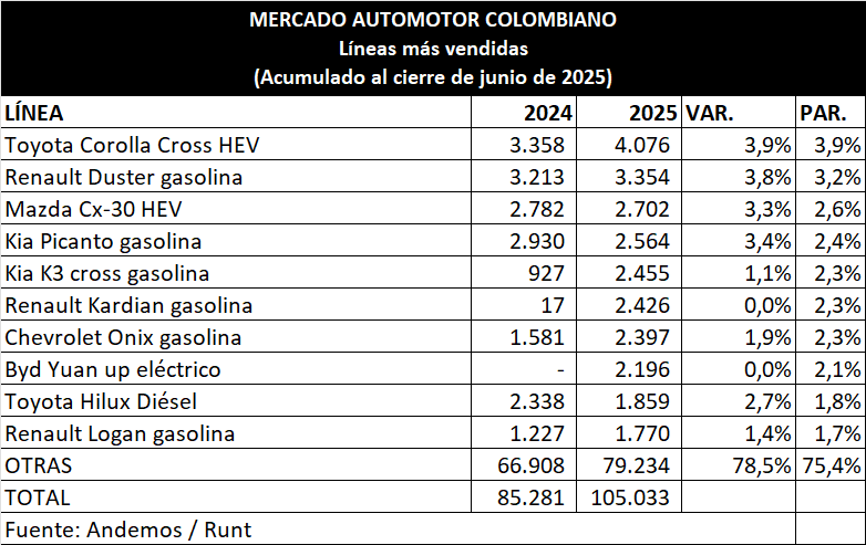 El mercado automotor colombiano consolida su recuperación en 2025. Según el más reciente informe de la Asociación Nacional de Movilidad Sostenible (Andemos), entre enero y junio se matricularon 105.033 vehículos nuevos en el país, lo que representa un incremento del 23,2 % frente al mismo periodo del año anterior.